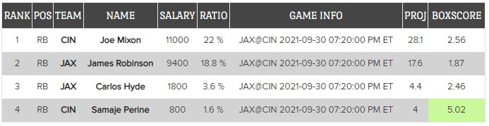 RB James Robinson is coming off of his best game of the 2021 campaign, turning 21 touches into 135 scrimmage yards against Arizona. Robinson hasn’t had a ton of success running the ball, partly due to the offense’s struggles to sustain drives and negative game scripts. He’s supplemented his output so far as a pass catcher and should be productive in that department again in this game against a Cincy defense that has ceded a league-high 31 receptions to running backs so far.