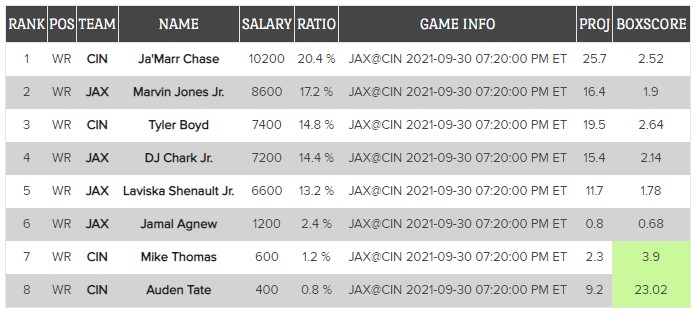 Cincinnati’s top wideout, Tee Higgins, has already been ruled out of this game with a shoulder injury. That makes red-hot rookie J’Marr Chase the Bengals’ top option facing Shaquil Griffin and a Jacksonville secondary that is allowing 39.7 fantasy points per game to enemy receivers. Chase has scored in each of Cincinnati’s first three contests and walks into this game as the No. 11 fantasy wideout in PPR formats.