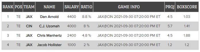 The absence of Higgins should send more targets to slot receiver Tyler Boyd, who gets an excellent matchup versus Jacksonville slot corner Chris Claybrooks. The Jaguars have allowed the fourth-most receiving yards per attempt to slot receivers, per PFF. Boyd is a solid WR3.