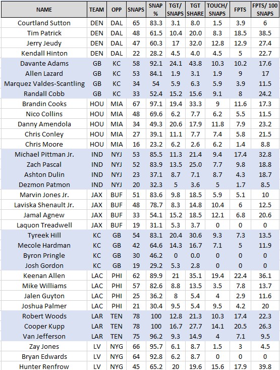Major props to Robert Woods and Cooper Kupp, who both logged 100% snap rates last week in LA’s loss to the Titans. But an even more promising development might have been Van Jefferson, who played 75-of-78 and saw another seven targets- his third consecutive game with 6-plus looks.