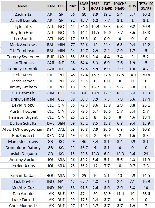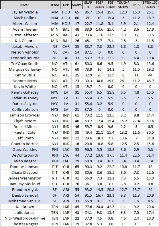 Olamide Zaccheaus led all NFL wideouts in Week 9 with 0.61 fantasy points per snap but don’t expect a repeat of those gaudy numbers. Zacchaeus has been well behind Russell Gage, Tajae Sharpe, and Kyle Pitts in the snap pecking order and will be irrelevant if/when Calvin Ridley returns.