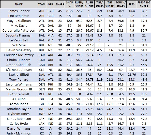 No surprise to see Najee Harris accrue the most snaps (76) of any running back in Week 10. Harris has played 540 snaps so far in 2021, a full 90(!) more than Ezekiel Elliott, who is in second place. Harris also has 133 more snaps and one less game played than overall RB1 Jonathan Taylor.