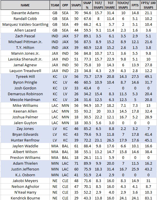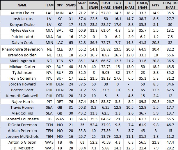 Playing time hasn’t been a negative factor for Mike Williams, who was in on a team-high 94.9% of LA’s snaps. But after another outing with fewer than 40 receiving yards, one has to wonder if Williams is playing through an injury, or simply had outlier games in September. Williams has now produced single-digit PPR performances in five of his last six games.