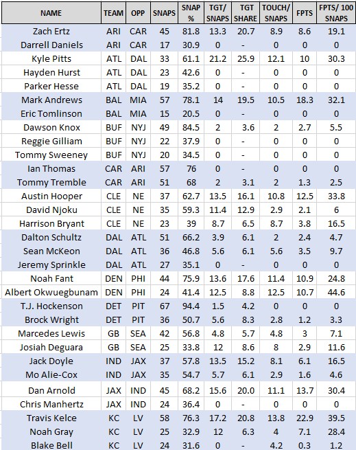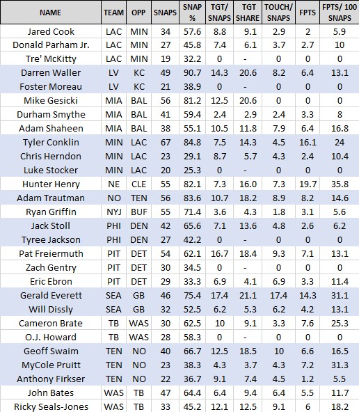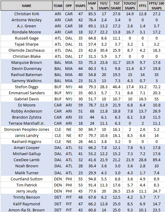 Nothing wrong with D.J. Moore’s 59 snaps but the lack of production continues to be so frustrating. Moore ranked 13th overall in snaps last week but 70th in fantasy points per snap. Perhaps the change to Cam Newton, who has a brilliant history with Moore, will be the catalyst that changes Moore’s fantasy fortune.