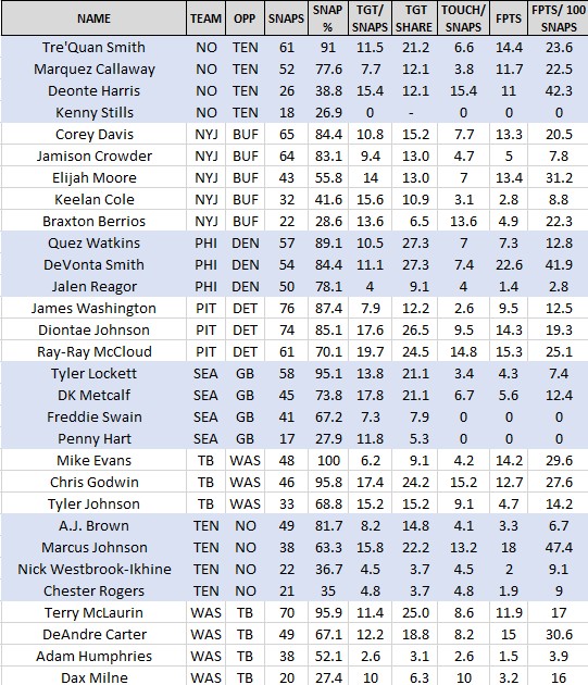 The overall snap leader for Week 10: Pittsburgh’s James Washington, who had a 12.2% target share on a position-leading 76 snaps. Playing without Ben Roethlisberger certainly didn’t help the Steelers’ offense and the club was lucky to escape with a tie.