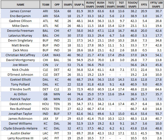 Jonathan Taylor played 57 snaps and accrued .937 fantasy points per snap- the highest figure we’ve ever tracked for a player who played more than 50 snaps. Taylor is now second overall in that metric, behind only Cordarrelle Patterson for the season.