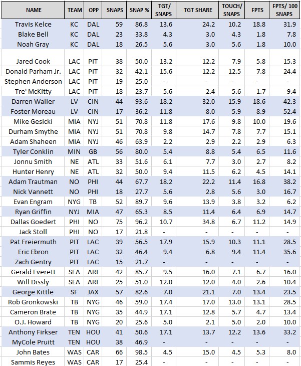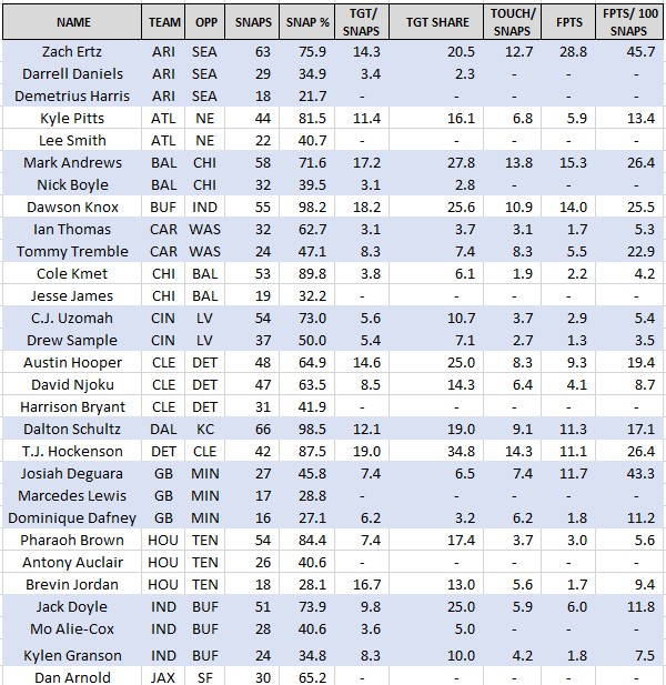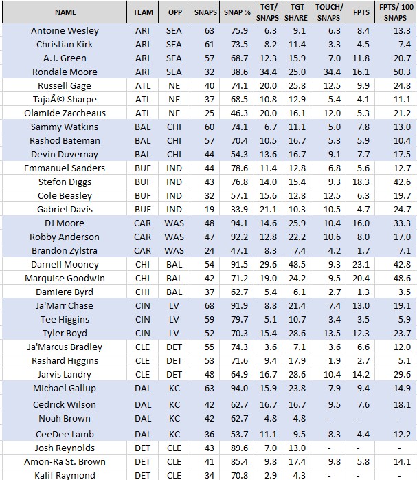 Another guy we loved this summer, Rondale Moore had a career-high 11 reception and an impressive 100% catch rate, while ranking 5th overall at wide receiver for the week with .503 fantasy points per snap. Moore does great things when given touches but just can’t be guaranteed a substantial role on a loaded Arizona roster.