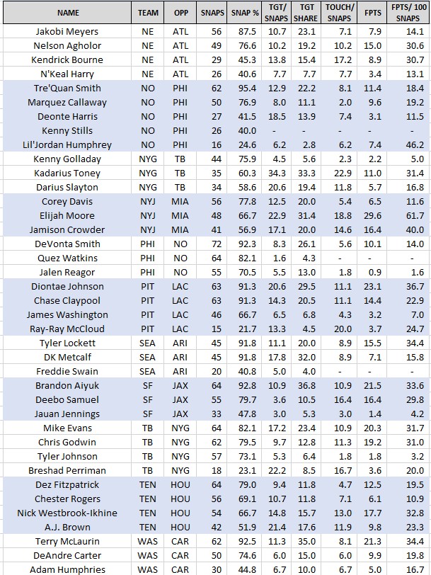 PTS/100 SNAPS Average fantasy points scored by player per 100 snaps