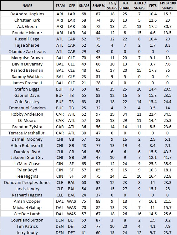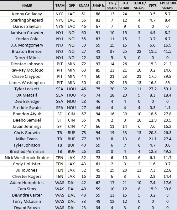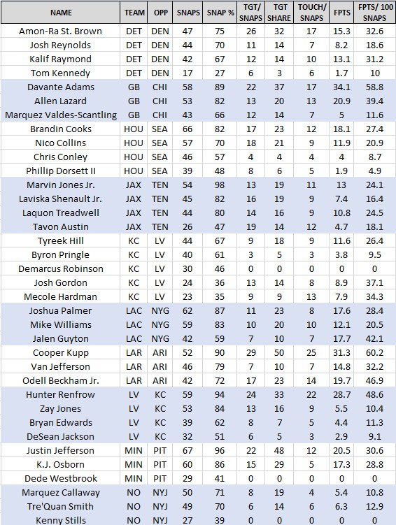 PTS/100 SNAPS Average fantasy points scored by player per 100 snaps