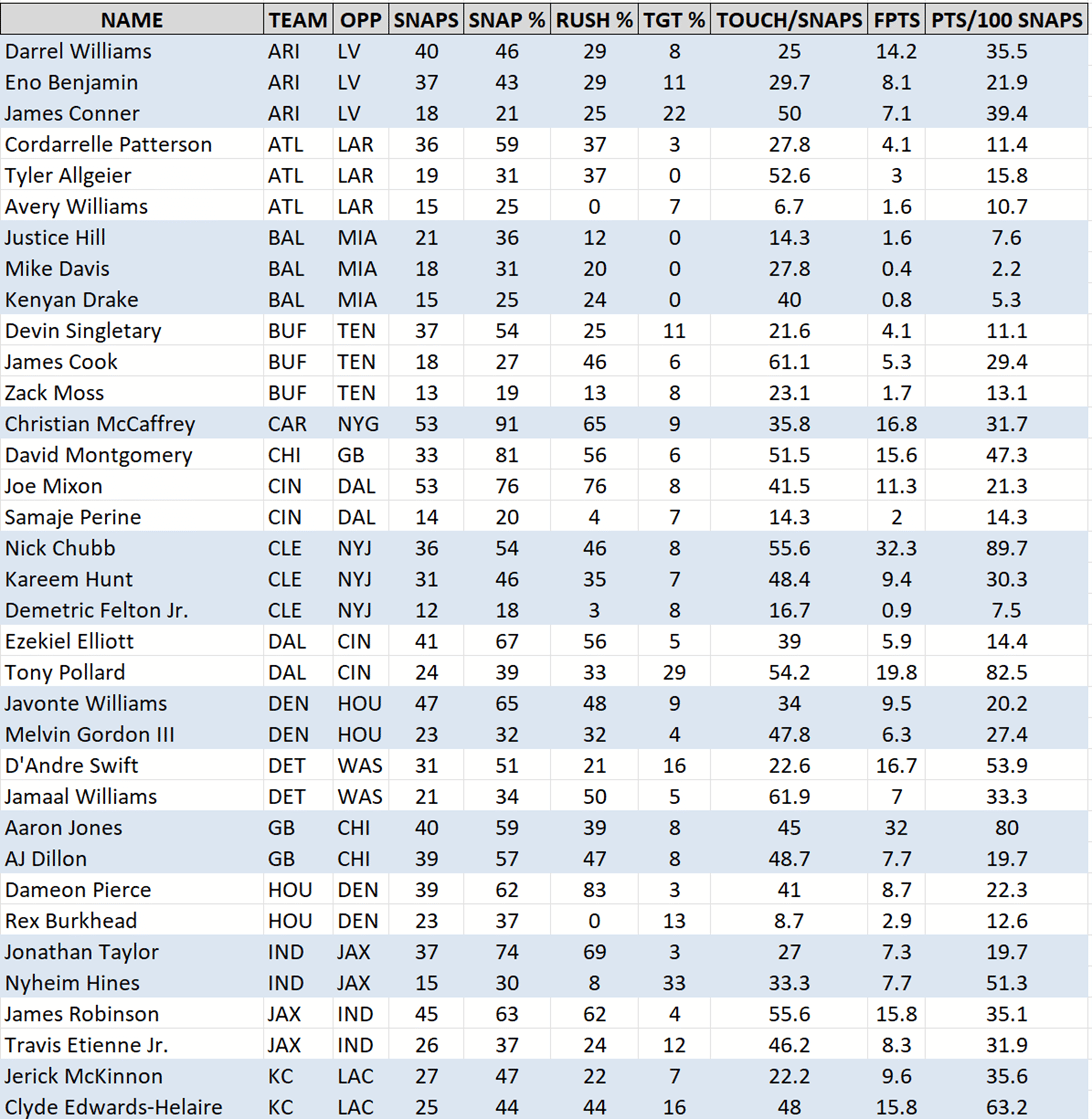 • Joe Mixon leads all running backs with 63 snaps per game. He also ranks third with a 78% rush share, trailing only Josh Jacobs and Jonathan Taylor.