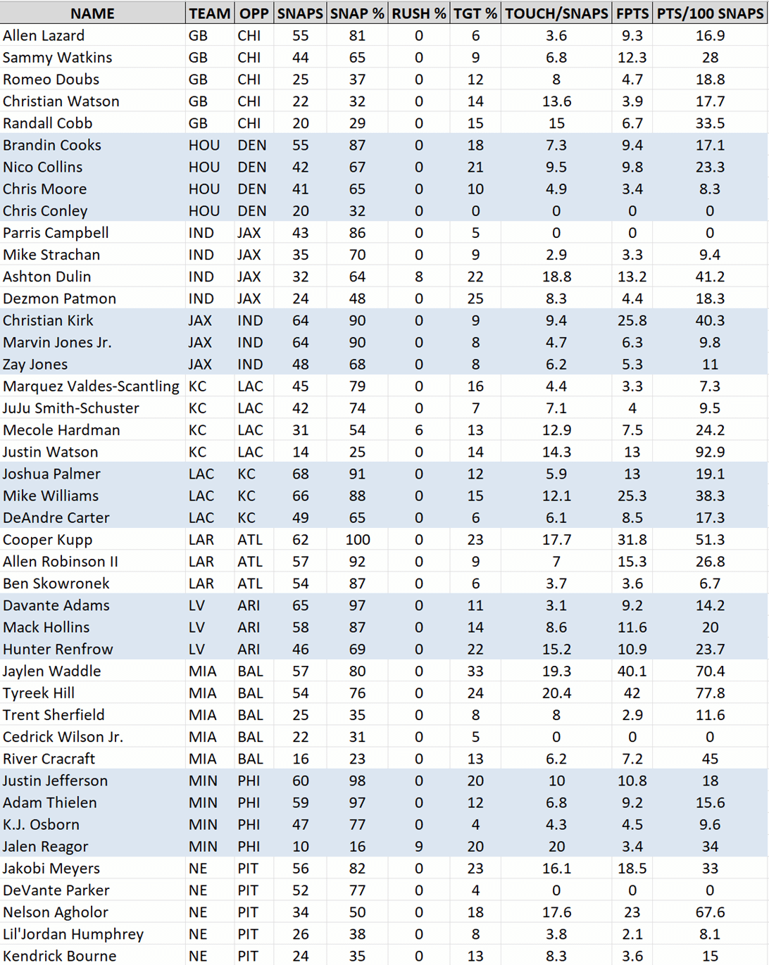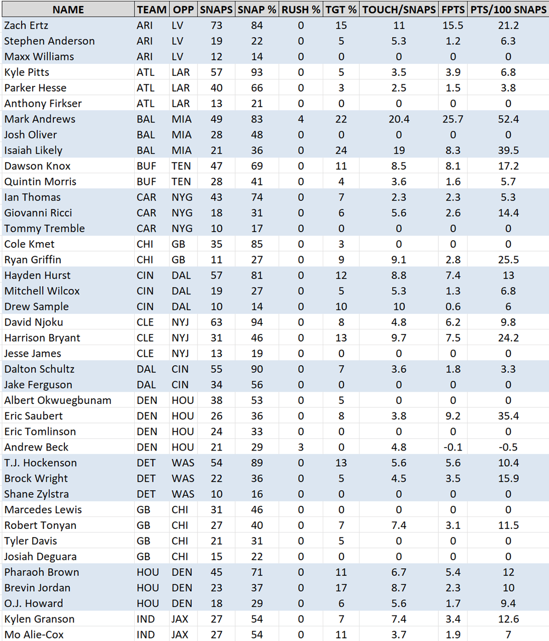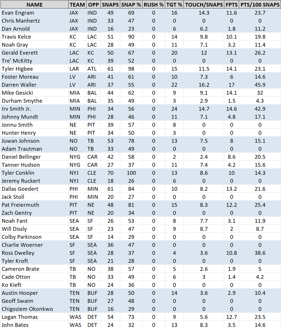 • Tyler Conklin leads all tight ends with a 73.5% snap rate. He also is tied with Travis Kecle for fourth at the position with 16 targets. As long as Joe Flacco remains under center, Conklin looks like a solid streaming option.