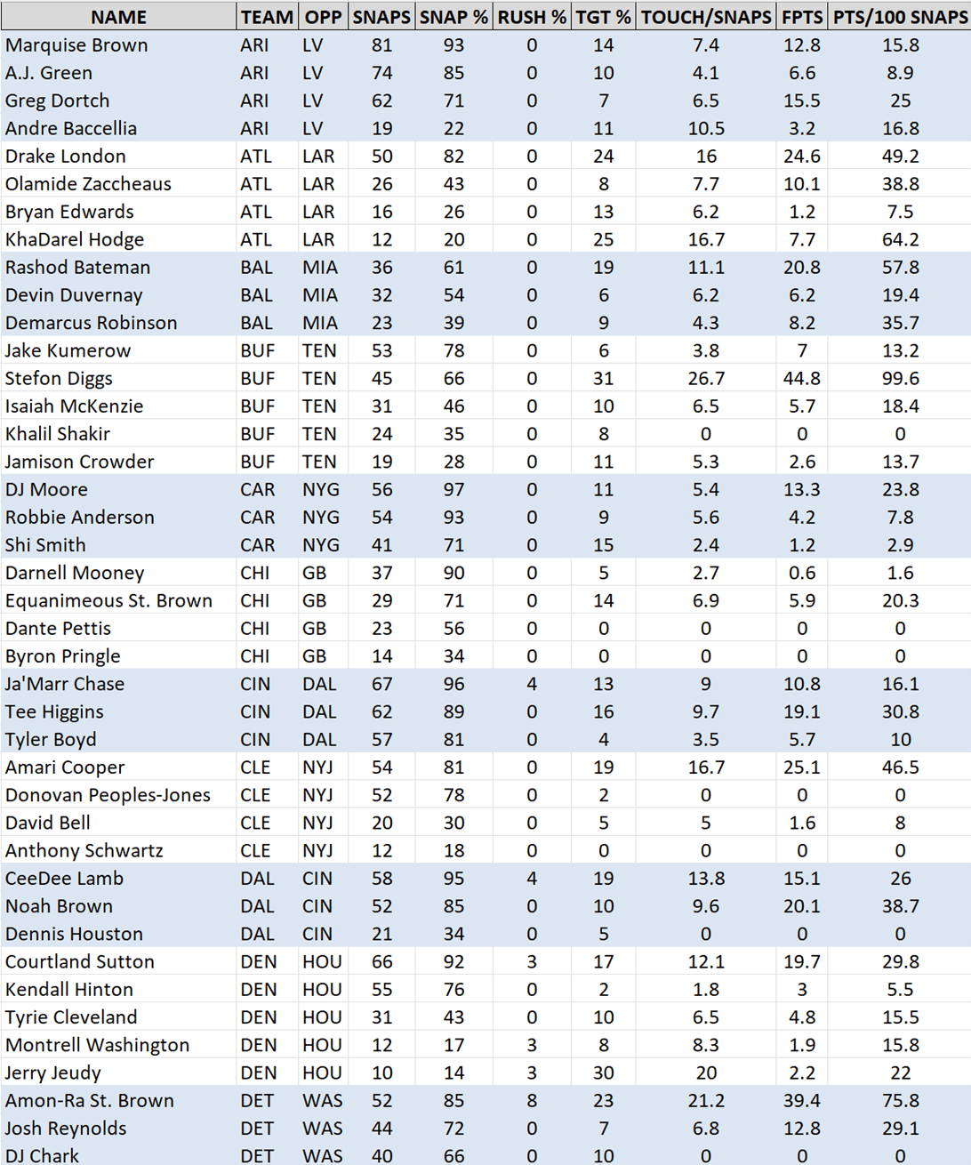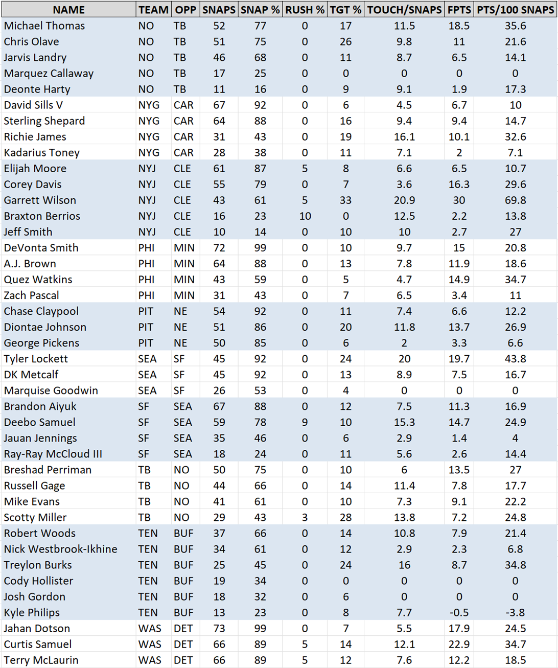 PTS/100 SNAPS Average fantasy points scored by player per 100 snaps