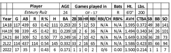 Ruiz had a quiet first four seasons in the minors (.263 over 205 runs, 32 home runs, 169 RBIs, and 144 stolen bases over 1,293 at-bats). His bat had significant improvement in 2021 and 2022, leading to impressive stats in runs (114), stolen bases (85), and batting average (.332) over only 437 at-bats. Ruiz even showed more power (16 home runs and 65 RBIs) while improving his approach (strikeout rate – 17.4 and walk rate – 12.2).
