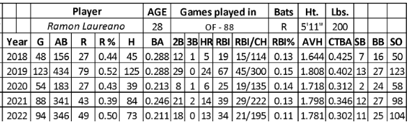 Laureano has been a bust in three consecutive seasons. His strikeout rate (27.2) remains high, with a further step back in his walk rate (6.5). In addition, he has been horrible with runners on base in 2021 and 2022 based on his RBI rates (13 and 11). Laureano has a reasonable average hit rate (1.781), but his contact batting average (.302) last season is well below his 2019 season (.402).
