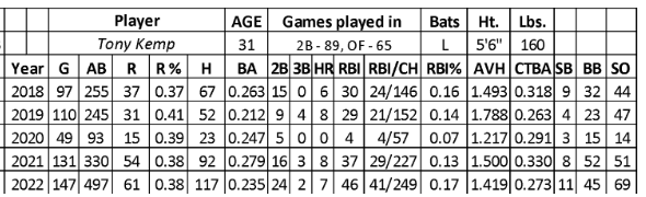 The weakness in the A’s starting lineup led to Kemp again setting career highs in 2022. Unfortunately, his contact batting average (.273) was well below 2021 (.330), with regression as well in his average hit rate (1.419) and walk rate (8.1 – 13.1 in 2020 and 2021). Kemp had no business being in the starting lineup vs. lefties (.219/7/1/8 over 73 at-bats). His season ended with better play over his final 184 at-bats (.272 with 29 runs, three home runs, 25 RBIs, and five stolen bases).