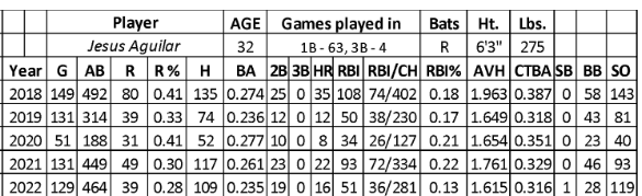 Last season, Aguilar stumbled in April (.231/5/1/1/6 over 65 at-bats), followed by underwhelming play over the following three months (.246 with 28 runs, 11 home runs, and 37 RBIs over 289 at-bats). The Marlins released him in late August, leading a step back in playing time with the Orioles in September. He only hit .209 over his final 110 at-bats, with six runs, four home runs, and eight RBIs.