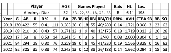 Diaz was serviceable in 2016 (.300/71/17/65/4 over 404 at-bats) and 2018 (.263/55/18/55/3 over 422 at-bats) when he had his best opportunity for starting at-bats. Over four seasons with Houston, Diaz hit .255 with 107 runs, 32 home runs, 129 RBIs, and three steals over 867 at-bats.