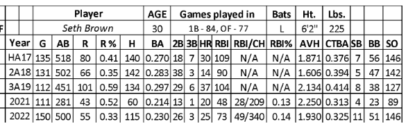 Oakland gave him platoon at-bats against right-handing pitching (.220/19/46 over 259 at-bats) in 2021. Brown only had 22 at-bats vs. lefties (3-for-22 with one home run and two RBI).