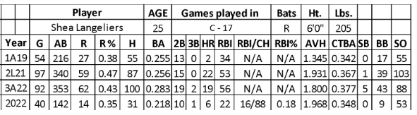 Over the past two seasons, Langeliers found his power stroke (41 home runs and 109 RBIs) between AA and AAA with a .270 batting average, 121 runs, and six stolen bases. His strikeout rate (24.3) came in higher than the league average while offering a favorable walk rate (10.4).