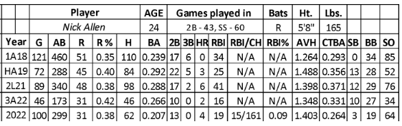 Allen hit .267 over 1,399 at-bats with 201 runs, 12 home runs, 130 RBIs, and 69 stolen bases over five seasons. His best stats came in 2021 between AA and AAA (.288 with 48 runs, six home runs, 41 RBIs, and 12 stolen bases). His walk rate (8.3) and strikeout rate (17.4) came in better than the league average.