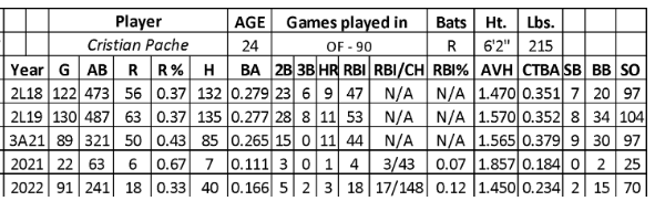 The Braves signed Pache as a 16-year-old out of the Dominican Republic in 2015. Over six seasons in the minors, he hit .278 with 272 runs, 36 home runs, 235 RBIs, and 68 stolen bases over 2,127 at-bats. However, he failed to hit a home run over his first two seasons (689 at-bats) while offering a weak average hit rate (1.235).