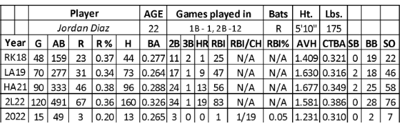 Diaz failed to make an impact over his first four seasons in the minors. He hit .274 over 796 at-bats with 102 runs, 23 home runs, 130 RBIs, and five stolen bases. His bat improved significantly in 2022 (.326/67/19/83 over 491 at-bats) between AA and AAA. Diaz has been tough to strike out (14.7%) in the minors with a below-par walk rate (6.2).