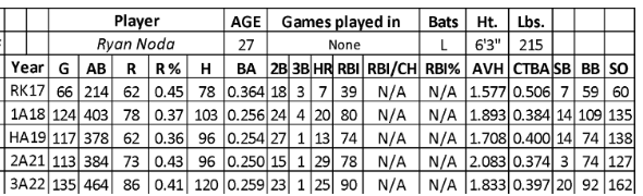 The A’s selected Noda in the 2022 Rule 5 Draft. Over his five years in the minors, he hit .264 with 361 runs, 94 home runs, 361 RBIs, and 58 stolen bases over 1,843 at-bats. At every level, Noda showed the ability to take walks (17.6%) while having some weakness in his strikeout rate (26.8).