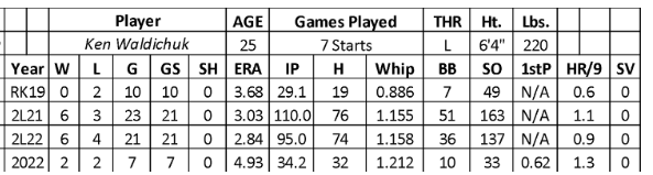 His average fastball (94.2) came in slightly above the league average. Waldichuk offered a plus slider (.094 BAA), along with success with his changeup (.219 BAA) and show-me curveball (no hits over five at-bats). However, batters beat up his four-seam fastball (.342 BAA and .633 SLG).