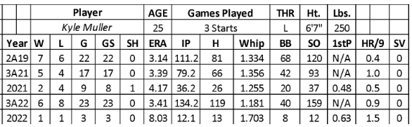 Over six seasons in the minors, Muller went 31-22 with a 3.18 ERA and 588 strikeouts over 541 innings. His arm progressed over two years at AAA (3.40 ERA, 1.246 WHIP, and 252 strikeouts over 214.1 innings).