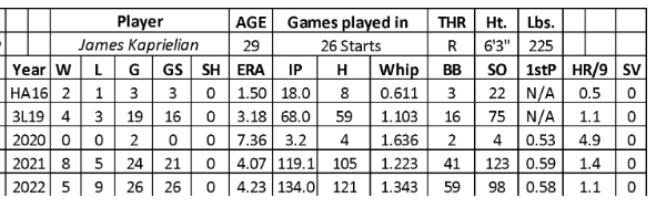 His average fastball (94.0) showed more life than in 2021 (93.1) Kaprielian offered a winning slider (.206 BAA) and curveball (.222 BAA). Batters had 10 home runs off his four-seam fastball (.250 BAA). He also had some success with his sinker (.200 BAA) while losing the feel for his changeup (.333 BAA).
