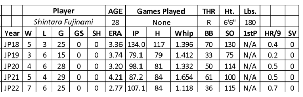 Fujinami pitched well in Japan over his first four seasons (43-32 with a 2.94 ERA, 1.240 WHIP, and 705 strikeouts over 675.2 innings). His highlight season at age 22 came in 2015 (14-7 with a 2.40 ERA and 221 strikeouts over 199 innings).