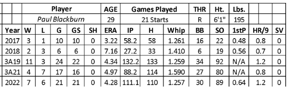 In 2018, he developed a right forearm injury that led to a couple of months on the injured list to start the year. Blackburn was back on the shelf with a right elbow issue within a month. His arm lost value between 2019 and 2021 at AAA (4.59 ERA and 172 strikeouts over 221.1 innings).