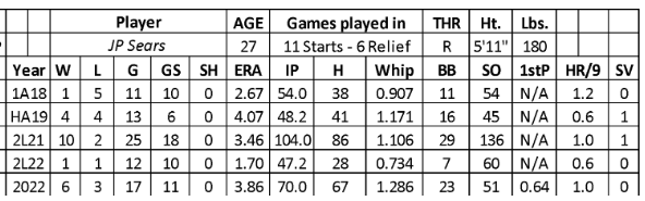 Between New York and Oakland in 2022, Sears made 17 appearances with a step back in results (6-3 with a 3.86 ERA, 1.286 WHIP, and 51 strikeouts over 70 innings). His walk rate (3.0) had regression, and he lost his strikeout ability (6.6 per nine). All eight of his home runs allowed were to right-handed batters.