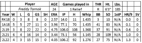Tarnok battled his way over his first three seasons in the minors, leading to a 4.29 ERA and 184 strikeouts over 197.1 innings. His walk rate (4.0) held him back in 2018 and 2019. However, he improved over the last two seasons between AA and AAA (7-5 with a 3.62 ERA, 1.220 WHIP, and 185 strikeouts over 151.2 innings). The Braves gave him two-thirds of an inning of work in the majors (no runs, one hit, and one strikeout).