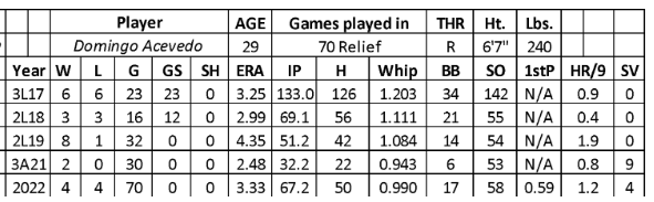Acevedo went 28-17 over eight seasons in the minors with a 2.98 ERA and 524 strikeouts while working as a starter until 2018. The A’s moved him to their closer at AAA in 2021 (2-0 with a 2.48 ERA and 53 strikeouts over 32.2 innings). He had the lowest walk rate (1.7) and highest strikeouts rate (14.6) of his career.