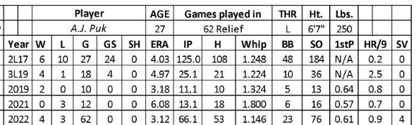 After one appearance on April 5th (no runs over 3.1 innings with four strikeouts) in 2021, Puk landed on the injured list with a biceps issue. His arm offered no value at AAA (6.10 ERA over 48.2 innings). In August, with the A’s, he made some progress (4.15 ERA and 10 strikeouts over 8.2 innings), but Oakland parked him in the barn after three poor games in September (five runs, nine baserunners, and two strikeouts over 1.1 innings).