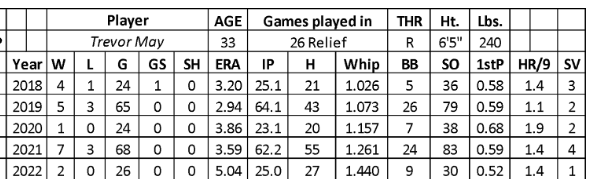 From 2018 to 2021, May has been a trusted reliever (17-7 with a 3.33 ERA, 236 strikeouts, and 11 saves over 175.2 innings). His risk moving toward the ninth inning is his home runs allowed (1.4 per nine).