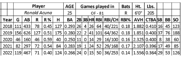 His strikeout rate (23.6) matched his career-best in 2021, but he took fewer walks (9.9% – 11.4 in his career). Acuna had a sharp decline in his average hit rate (1.556 – 1.955 from 2018 to 2021), showing that his right knee was not all the way back from his injury. Over the winter, he went 15-for-34 with 10 runs, two home runs, and six RBIs in Venezuelan League.