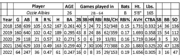 Last year, he landed on the injured list in mid-June, costing him all but two games for the remainder of the season due to a broken left foot and fractured finger on his right hand. Over his 64 games, Albies underperformed his 2021 season in average hit rate (1.656 – 1.883) and contact batting average (.305 – .325). He continued to succeed with runners on base (RBI rate – 19). His strikeout rate (17.5) was a three-year low, with a below-par walk rate (6.0 – 6.6 in his career).