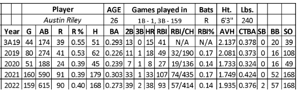 Only three of his 33 home runs came off left-handed pitching (.274 BAA over 135 at-bats) in 2021. Riley teed off of lefties (.329/21/11/25 over 149 at-bats) last year. From June 25th to August 9th, his bat was on fire (.381 over 155 at-bats with 27 runs, 12 home runs, and 33 RBIs). Unfortunately, he lost his swing/edge over his final 50 games (.215/24/8/19 over 186 at-bats).
