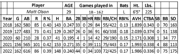 Over the past two seasons, Olson has settled into a productive, high-power bat (73 home runs and 214 RBIs) while still finding his way on the approach side of the game. His walk rate (10.7) has been an area of strength every season in the majors, but his strikeout rate (24.3) has been up and down over the past three seasons (2020 – 31.4 and 2021 – 16.8). Other than 2019 (broken hamate bone to start the season), Olson missed only six combined games in 2018, 2020, 2021, and 2022, helping his counting stats.