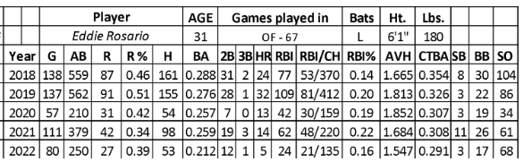 Fantasy Outlook: Blurred vision clearly was an issue for Rosario last season. When healthy, he limits the damage in strikeouts while showing clutch ability with runners on base (RBI rate of 20.1 from 2019 to 2021). His ADP (611) in the NFBC has him buried in the free-agent pool. I like his bat if he’s seeing the ball well in spring training, and the Braves name him their starting right fielder. The changes to the shift rule should help Rosario. Possibly .270 with 70 runs, 20 home runs, and 75 RBIs if he gets enough at-bats against lefties.