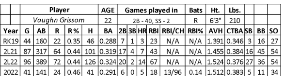 Over three short seasons in the minors, Grissom hit .315 with 158 runs, 24 home runs, 133 RBIs, and 46 stolen bases over 866 at-bats. His strikeout rate (13.4) and walk rate (9.6) have top-of-the-order upside. Last year, his bat showed growth at High A (.312/62/11/55/20 over 298 at-bats), leading to a promotion to AA (.363 over 91 at-bats with three home runs, 12 RBIs, and seven steals).