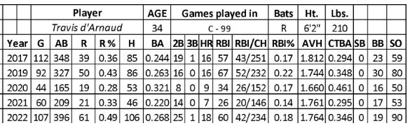 After a quiet opening month in 2021 (.220 over 82 at-bats with five runs, two home runs, and 11 RBI2), d’Arnaud landed on the injured list for almost 14 weeks with a sprained left thumb. He hit .222 with 16 runs, five home runs, and 15 RBIs over 126 at-bats to end the season.
