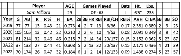 Over seven seasons in the minors, Hilliard hit .276 with 436 runs, 116 home runs, 427 RBIs, and 134 stolen bases over 2,475 at-bats, highlighted by his success in 2019 at AAA (.262 with 35 home runs, 101 RBIs, and 22 stolen bases over 500 at-bats). The Rockies kept him at AAA over three seasons (.264/167/62/170/32 over 821 at-bats).