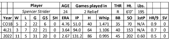 Last season, Strider made the Braves’ opening-day roster. Over his first 12 appearances, he posted a 2.83 ERA, 1.094 WHIP, .178 BAA, and 44 strikeouts over 28.2 innings. His arm gave Atlanta 19 electric starts over the final four months of the season (2.62 ERA, 0.971 WHIP, .180 BAA, and 158 strikeouts over 103 innings. Strider completed six innings in 10 starts while tossing more than 100 pitches over his final six appearances.