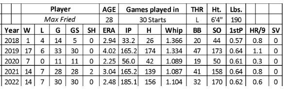 He is a ground ball pitcher (51.2) who has a slightly rising flyball rate (29.6 – 25.9 in his career). His average fastball (94.0) almost matched 2021 while relying on his three secondary pitches (curveball – .176 BAA, slider – .228 BAA), and changeup – .177 BAA). Fried did not beat the league average with his four-seamer (.265 BAA) and sinker (.267 BAA).