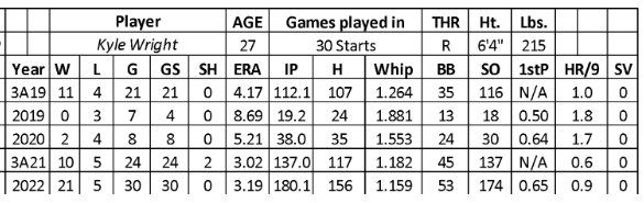 Over four seasons in the minors, Wright went 29-19 with a 3.47 ERA with 404 strikeouts over 404.1 innings. His arm played well at AAA (23-10 with a 3.43 ERA and 281 strikeouts over 278 innings). Atlanta drafted him with the fifth overall pick in 2017.