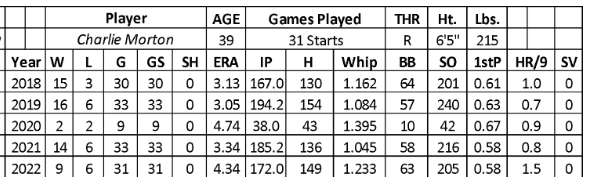 Last year, his arm was more down than up over his first 12 starts (5.67 ERA, 1.475 WHIP, and 66 strikeouts over 60.1 innings). He threw the better over his next 12 starts (2.64 ERA, 0.933 WHIP, .186 BAA, and 98 strikeouts over 75 innings) despite struggling in three games (14 runs, 24 baserunners, and six home runs over 16 innings). Morton lost his way again over his final 36.2 innings (5.65 ERA, 1.445 WHIP, and 10 strikeouts).