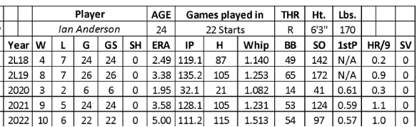 In 2021, Anderson pitched well over his first nine starts (4-1 with a 2.82 ERA and 53 strikeouts), but he battled his command (3.7 per nine). His arm regressed over his next 45 innings (4.40 ERA, 1.311 WHIP, and 45 strikeouts). He missed seven weeks over the summer with a right shoulder issue. Over his final six starts, Anderson posted a 3.62 ERA, .205 BAA, seven home runs, and 26 strikeouts over 32.1 innings.